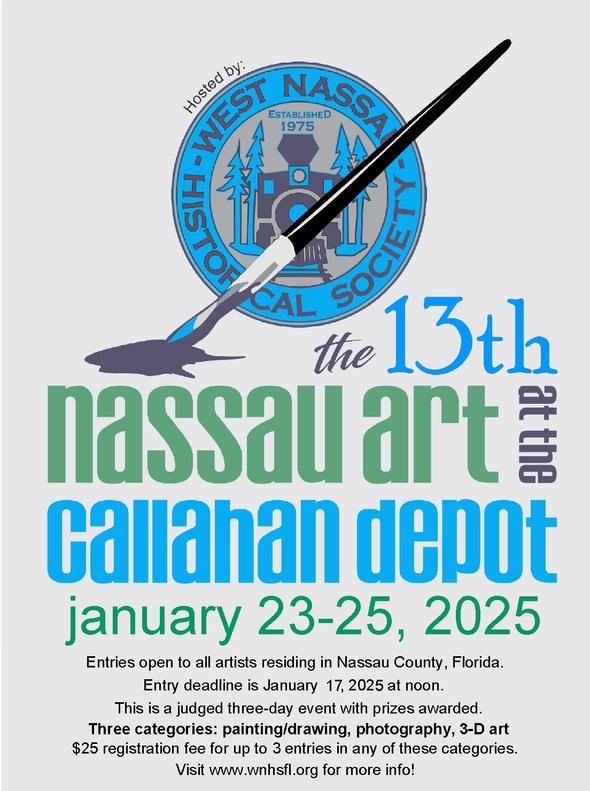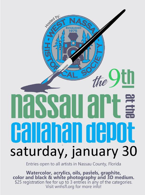 The West Nassau Historical Society would like to thank everyone who attended our 8th edition of Nassau Art at the Callahan Depot art show and sale held on January 25th. Over 220 visitors attended the annual juried event held inside the historic 1881 train station. 20 Nassau County artists displayed over 50 of their paintings, photographs and 3-D art while students from 5 local schools exhibited an addition 51 pieces of art. Some local artists also made scores of their works available for sale in our Art Shop. Thank you Nassau County artists and students! While the exhibition was being judged, historical society members and friends with support from Callahan Subway and Callahan BBQ hosted a delicious luncheon for the artists. The winners of the judged competition are as follows: 3-D art: 1st place, Elizabeth Wiegel; 2nd place, Christine Elsesser; 3rd place, Linda Vacca - Photography/CGI: 1st place, Shari Bickford; 2nd place, James Widerman; 3rd place, Cindy Belt - Painting/Drawing: 1st place, Barb Wylie; 2nd place, Gary Johns; 3rd place, Ann Wamack; People's Choice Award, Barbara Davis - Student Division: 1st place, Heidi Dinius; 2nd place, Josie Jordan; 3rd place, Afton Hamelin; 4th place, Heidi Dinius; 5th place, Heidi Dinius; 6th place, Emily Lefebvre. The 3 winning paintings and top photography winner from the adult division will be on display at the Nassau County Courthouse in Yulee from Jan 27 to Jan 31, Amelia Island Museum of History the week of Feb 2, Vystar Callahan branch the week of Feb 9 and Southeastern Bank Hilliard branch the week of Feb 16. We would like to thank renowned artist Pablo Rivera for judging our art competition and for all the artists and students who participated. The West Nassau Historical Society is a member of Arts and Culture Nassau, a county wide arts advocacy group that supports cultural events such as NACD. For pictures of all the art show entries like our Facebook page and visit www.wnhsfl.org for more info our all-volunteer 501c3 nonprofit and more upcoming events.